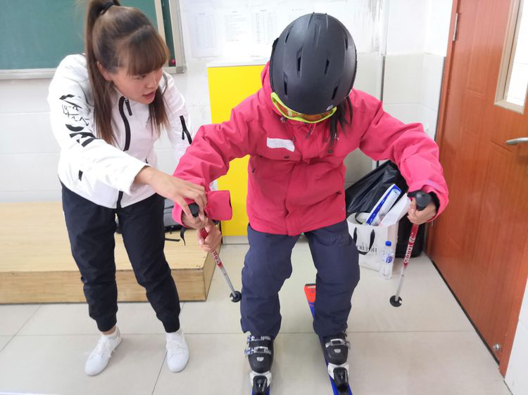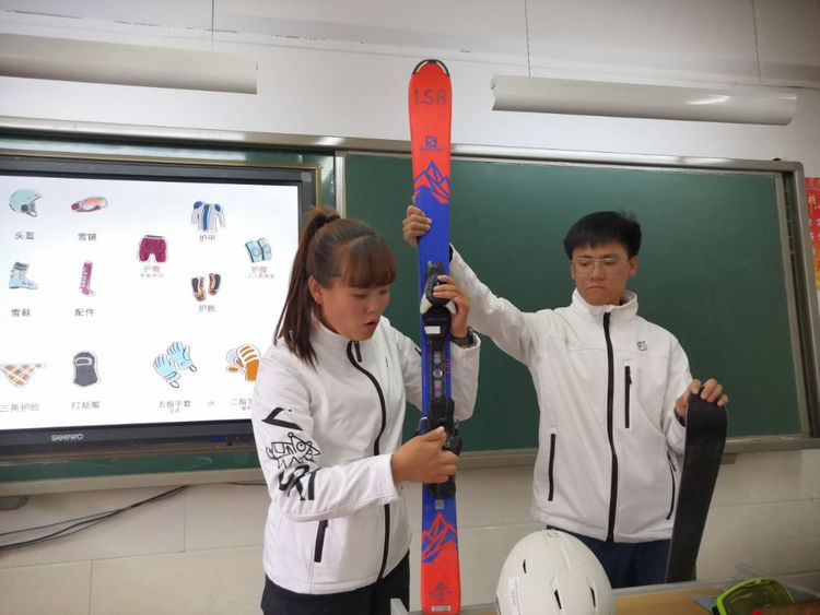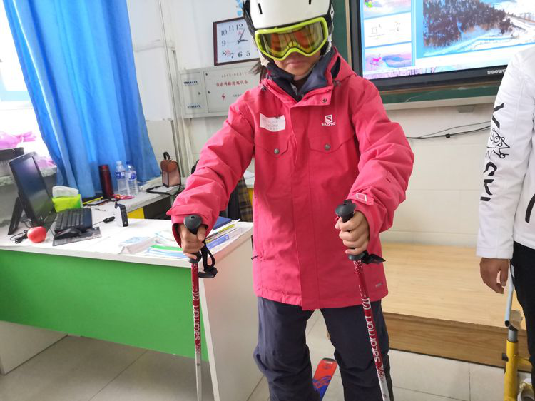 跃跃欲试的同学们在冰雪讲师的指导下亲身体验滑雪装备的魅力,兴奋不已。
